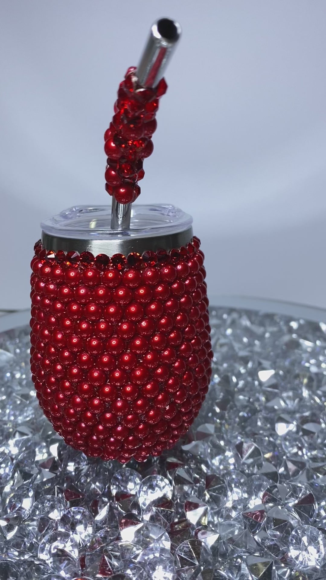 Stainless steel double-walled 3oz mini bubble tumbler with straw. Features a screw on lid with attached keychain for convenience. Tumbler and straw embellished wth hand placed glass elements and resin pearls. Great for on-the-go, cabaret, parties, and gift giving.